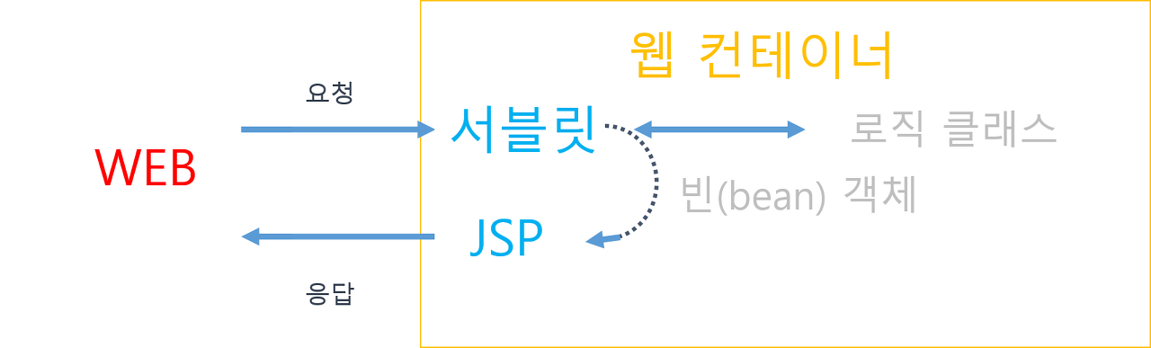 웹 브라우저의 요청을 서블릿이 받고 이후 알맞는 로직 클래스에 의해서 처리후 JSP 페이지로 포워딩 한다.