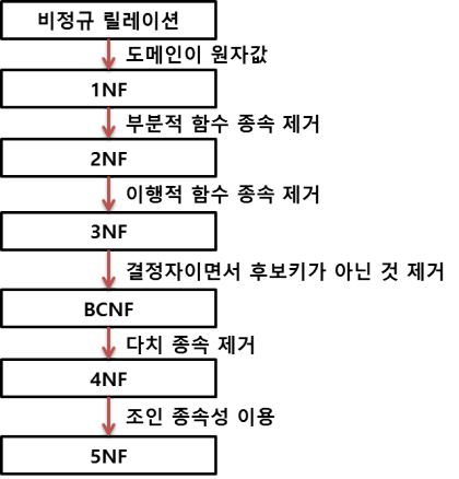 -릴레이션 R의 모든 속성 값이 원자값을 가지만 제 1정규형이라고 한다.
