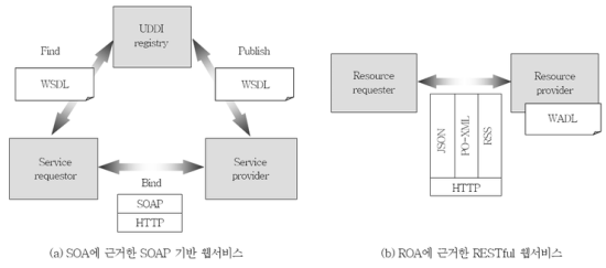 -OAP는 SOA(Service Oriented Architecture)로 서비스 지향 구조에 근거합니다. 이는 서비스 제공자가 UDDI에 레지스트리를 등록하고, 서비스 요청자가 원하는 서비스를 UDDI에서 검색한 후에 서비스를 요청하면 제공자는 그에 응답을 해줍니다. 반면 REST는 ROA(Resource Oriented Architecture) 즉, 리소스 지향 구조를 근거로 합니다. 이는 요청자가 리소스로 요청하면 중간 매체 없이 제공자가 직접 리소스로 응답을 해줍니다. 여기서 리소스(resource)란 REST 아키텍처의 핵심 요소로서 웹사이트, 블로그, 이미지, 음악, 이용자, 지도, 검색결과 등 웹에서 다른 이들과 공유하고자 개방된 모든 자원을 의미합니다. REST 구조에서의 리소스는 그들의 고유한 URI를 가집니다.