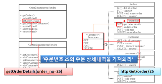 웹서비스라면 getOrderDetails(order_no=25)로 호출될 것이며, RESTful 웹서비스라면 http GET/order/25로 수행할 것이다. 즉 order 25가 리소스로서 GET 메소드로 관련 정보를 얻을 수 있습니다.