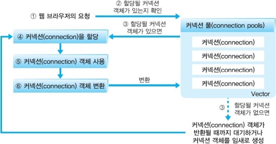 -위의 시스템 자원에 대한 문제를 해결하기 위해 커넥션 풀에 커넥션 객체들을 만들어 놓은 후, 커넥션 객체가 필요한 경우 작성한 객체를 할당해 주고, 사용이 끝난 후에는 다시 커넥션 풀로 회수하는 방법을 사용한다.