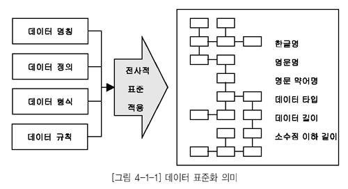 | 데이터 표준 관리 | - 데이터 표준 이행 - 데이터 표준 관리 절차 수립 : 데이터 표준 적용, 변경, 준수 검사 절차 |