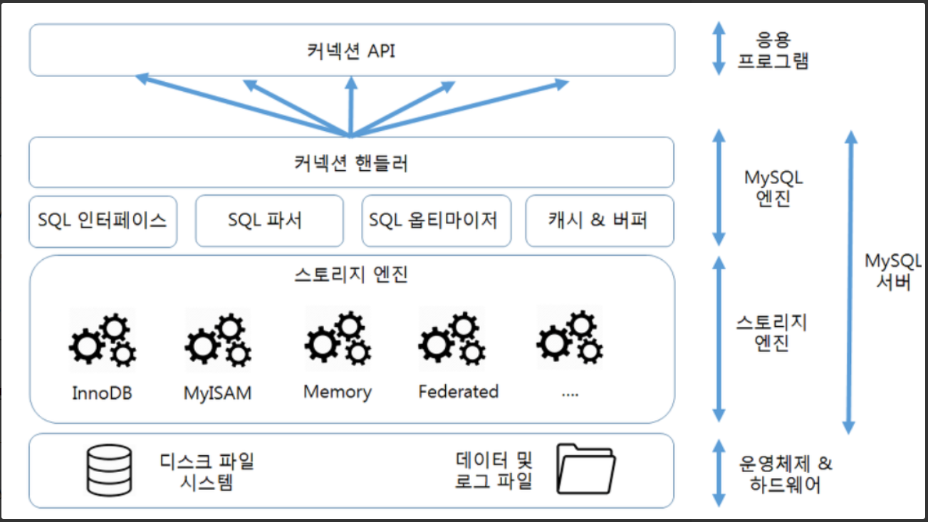 MySQL 서버는 MySQL엔진과 스토리지 엔진으로 구분된다.