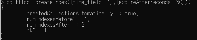 현재 데이터베이스의 ttlcol이라는 collection을 생성하고, time_field라는 인덱스를 생성한다. 그리고 옵션으로 30초 뒤에 만료되는 옵션을 설정한다.