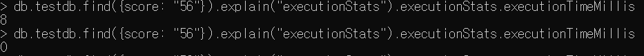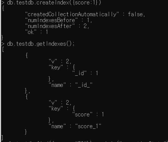 createIndex({score: 1})을 통해 스코어 기준 오름차순정렬(1)로 인덱스를 생성하고 잘 만들어 졌는지 확인도 했다. //내림차순 정렬은 -1