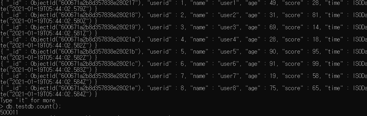 > for (i =0; i<500000; i++){ db.testdb.insert({ "userid" : i, "name": "user"+i, "age": Math.floor(Math.random()*100), "score": Math.floor(Math.random()*100), "time": new Date() });}
