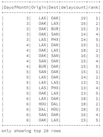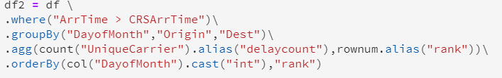 ROW_NUMBER () OVER (PARTITION BY DayofMonth ORDER BY count(UniqueCarrier) DESC) as rank FROM dfTable