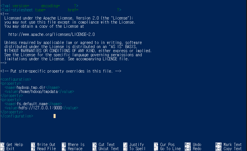 core-site.xml 파일에 아래의 텍스트를 붙여넣고 저장하고 나옵니다.