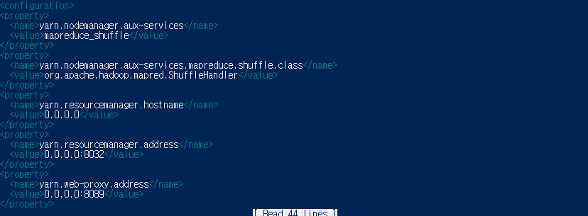 yarn-site.xml 파일에 아래의 텍스트를 붙여놓고 저장하고 나옵니다.
