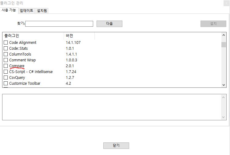 처음 Notepad++를 다운 받으셨다면, compare를 설치해야 합니다.