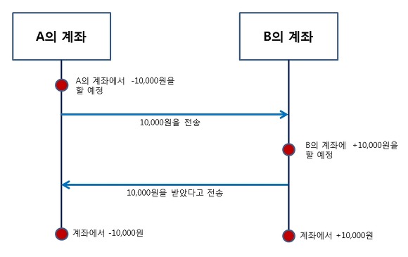 3. B의 계좌는 10,000원을 받았다는 걸 인지하고, A의 계좌에 10,000원을 받았다고 전송한다.