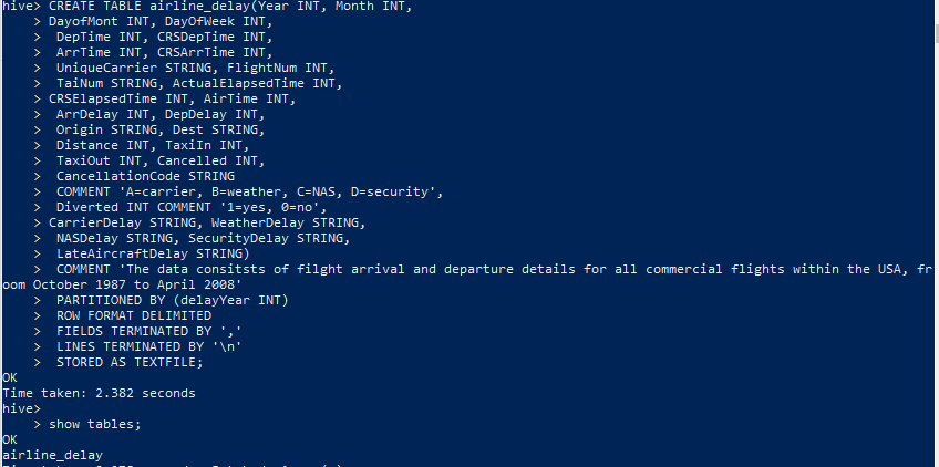 CarrierDelay STRING, WeatherDelay STRING,