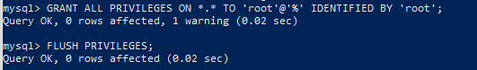 GRANT ALL PRIVILEGES ON *.* TO 'root'@'%' IDENTIFIED BY 'root';