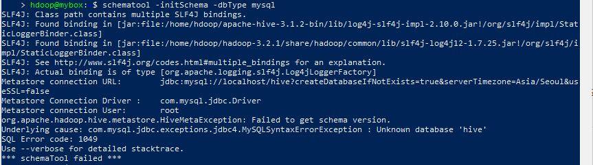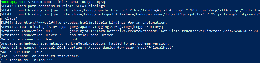 2) schematool -initSchema -dbType mysql을 하려니 sudo를 이용해 mysql에 접속하다 보니 접근권한 문제가 생겼습니다.