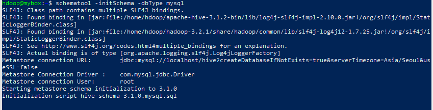 + mysql에 hive database를 createDatabaseIfNotExists=true로 생성을 못하는 것 같아서 mysql에서 직접 hive database를 create 해주었습니다.