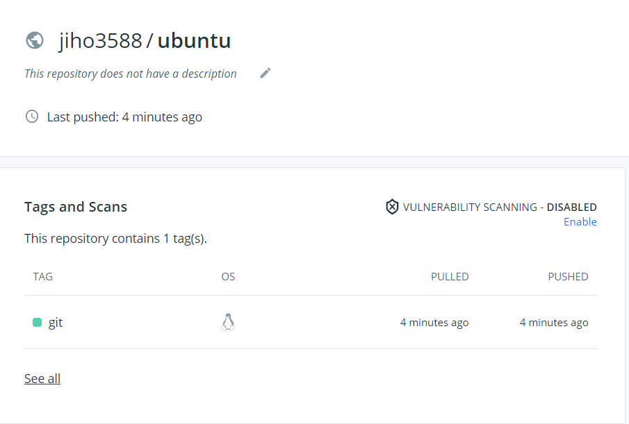 $ docker commit [container ID or container name] jiho3588/ubuntu:git
