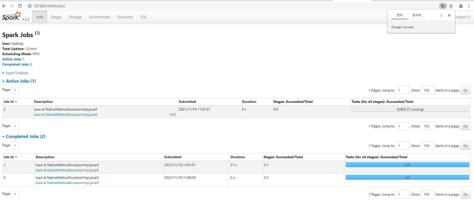4040포트가 포트포워딩 되어 있어야 합니다.(spark ui)
