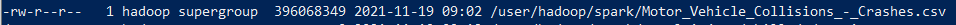 hdfs dfs -put Motor_Vehicle_Collisions_-_Crashes.csv /user/hadoop/spark