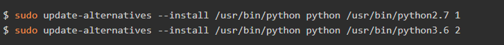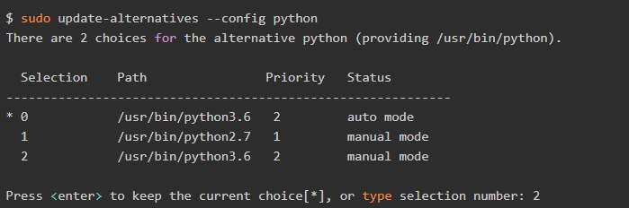 sudo update-alternatives --install /usr/bin/python python /usr/bin/python3.6 2