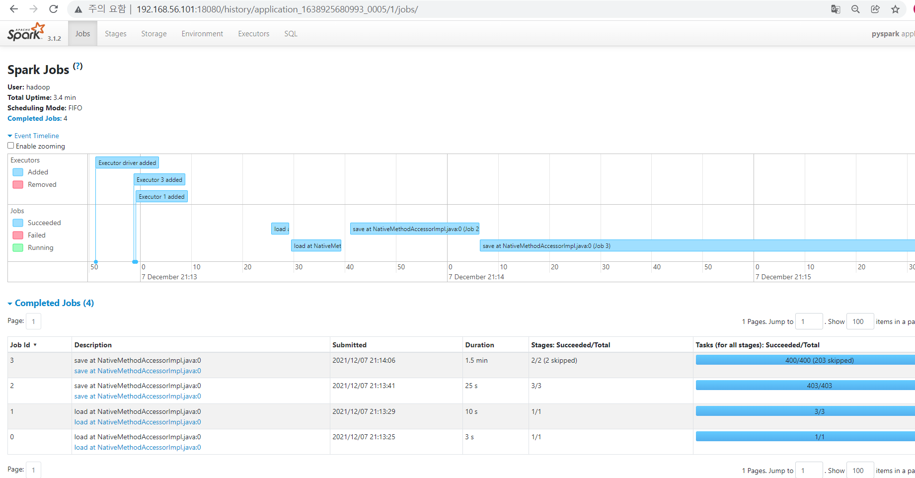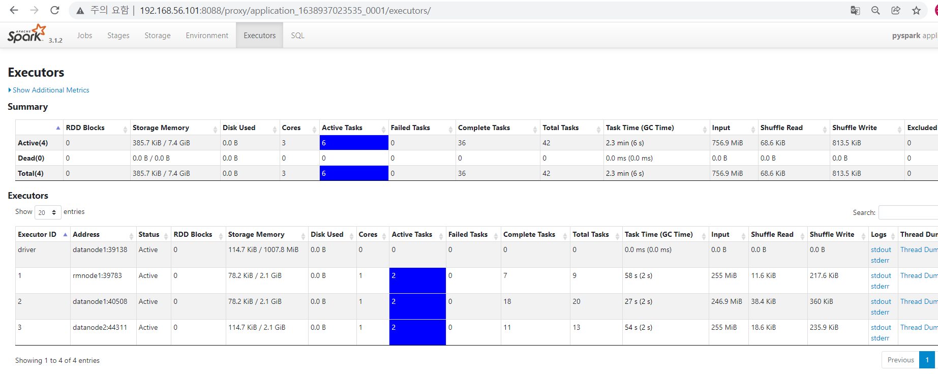 - spark config에서 설정한 4개의 executor가 실행되고 있는 지(driver 포함)