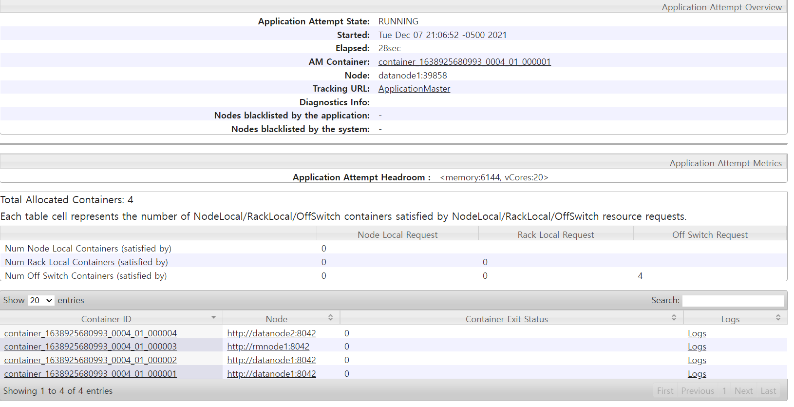 - yarn의 각 노드가 분산 처리 하고있는지(container확인)