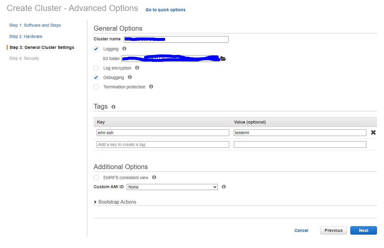- log 위치, log 보안, 디버깅, 예기치못한 클러스터 종료 예방 체크하기(체크해제되어야 클러스터를 내릴 수 있다)
