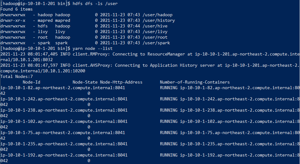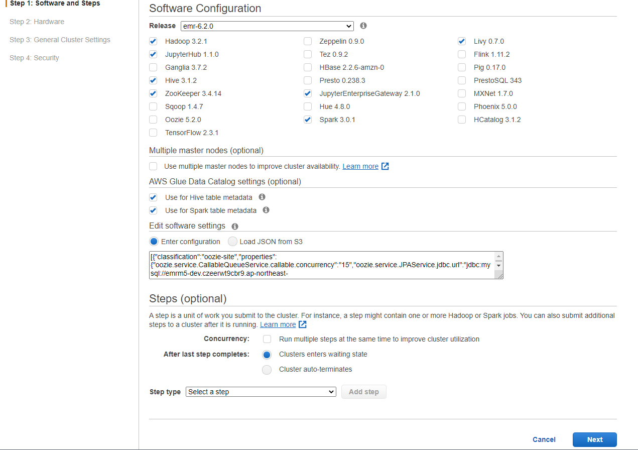 이번 포스트에는 EMR-6.2.0 버전을 Hadoop, Hive, Zookeeper, livy,Spark JupyterHub와 JupyterEnterpirseGateway를 포함하여 띄우겠습니다.