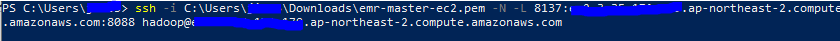 ssh -i pem키 위치\~~.pem -N -L [호스트pc에서 입력할 포트]:[master node의 public DNS]:[마스터 노드 내 접근할 프로세스의 포트번호] hadoop@[master node의 public DNS]
