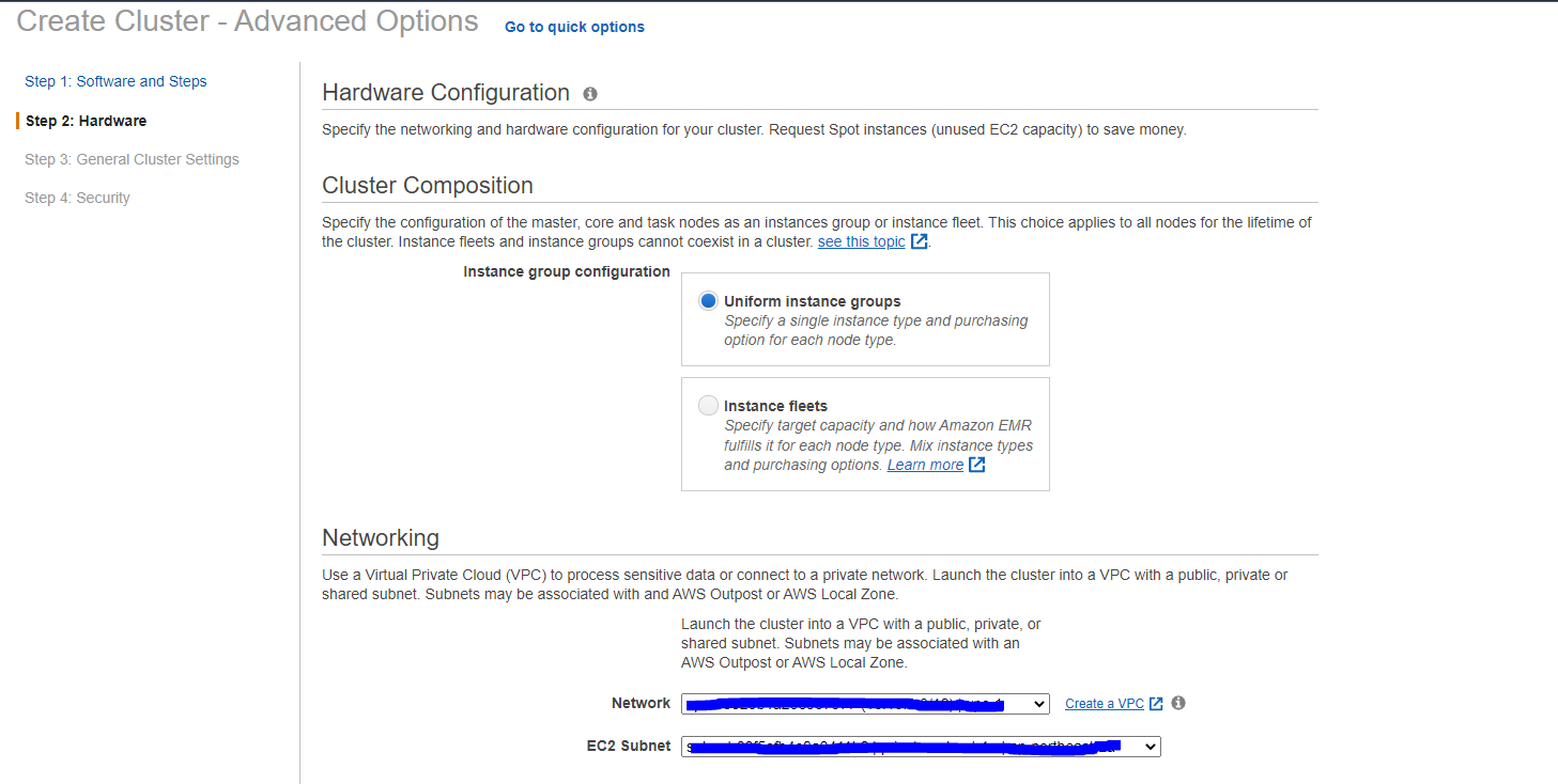 - security options에 EC2 keypair를 생성하여 emr-master-ec2 .pem file을 잘 보관해둔다.(masternode(ec2 instance)에 접근하기 위함)
