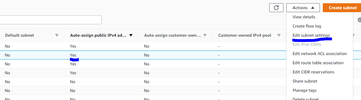 (subnets configure에서 Auto-assign public IPv4 address yes인지 체크)