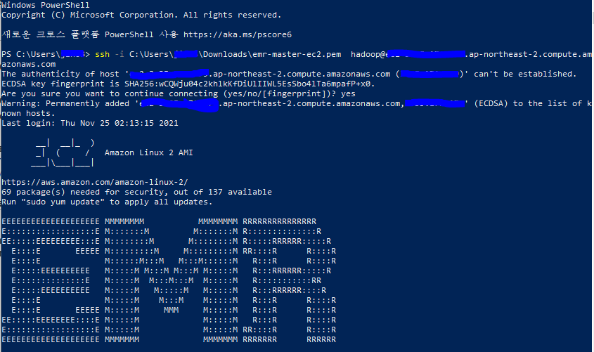 ssh -i ~/key위치/~.pem hadoop@public DNS