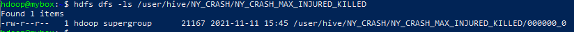 hdfs dfs -ls /user/hive/NY_CRASH/NY_CRASH_MAX_INJURED_KILLED/