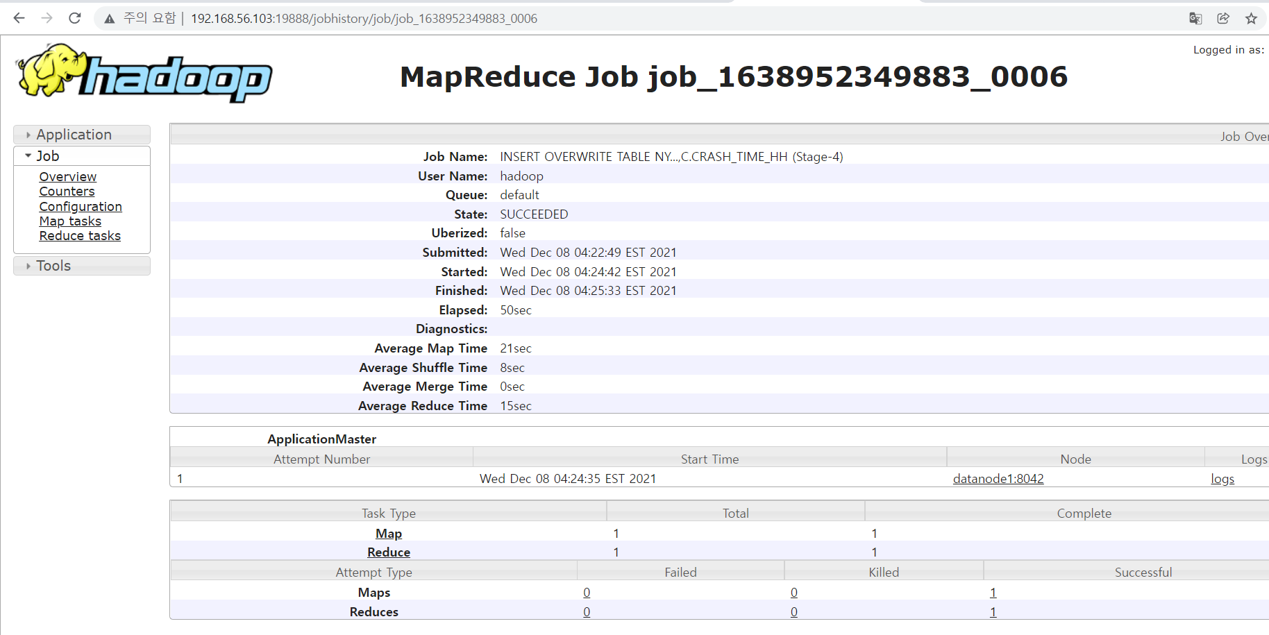 이것으로 간단한 예제를 통한 HQL파일로 하둡에 job제출하기를 실습 했습니다.