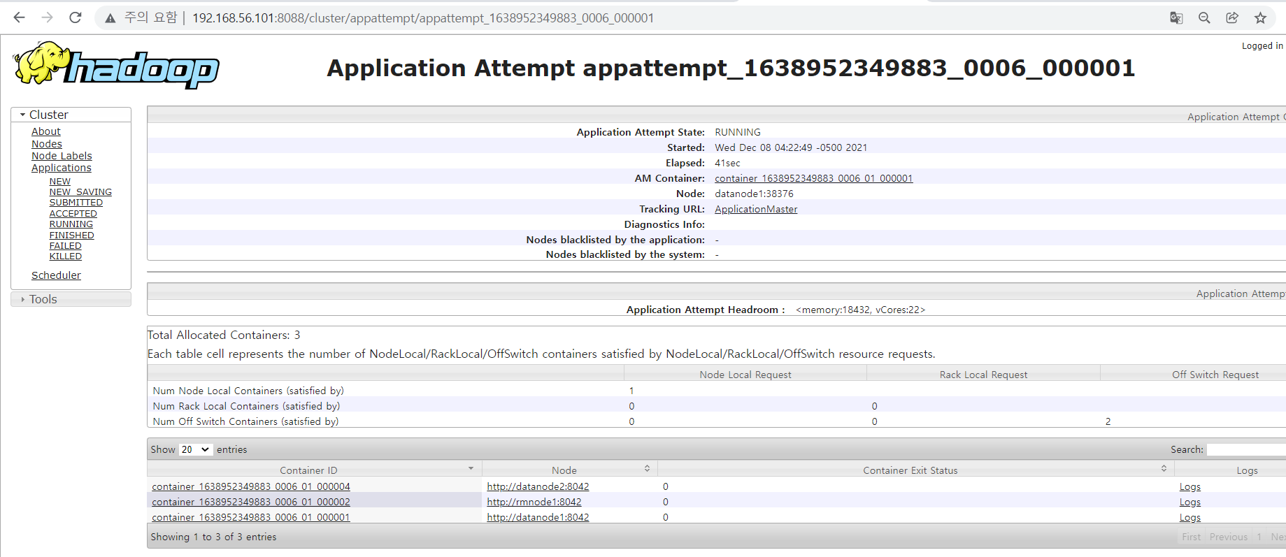 - 3개의 노드에서 각각 컨테이너를 띄워 분산처리를 하는 것을 확인 할 수 있습니다.
