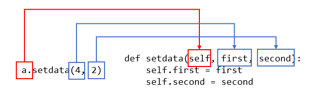- 객체를 호출할 때 호출한 자신이 전달되기 때문에 self라는 관례적인 이름을 사용, (다른 이름을 사용해도 상관x)