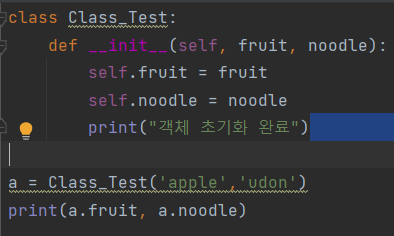__init__(self, 매개변수1, 매개변수2, ...): self.매개변수1 = 매개변수1 self.매개변수2 = 매개변수2 print("객체 초기화완료")