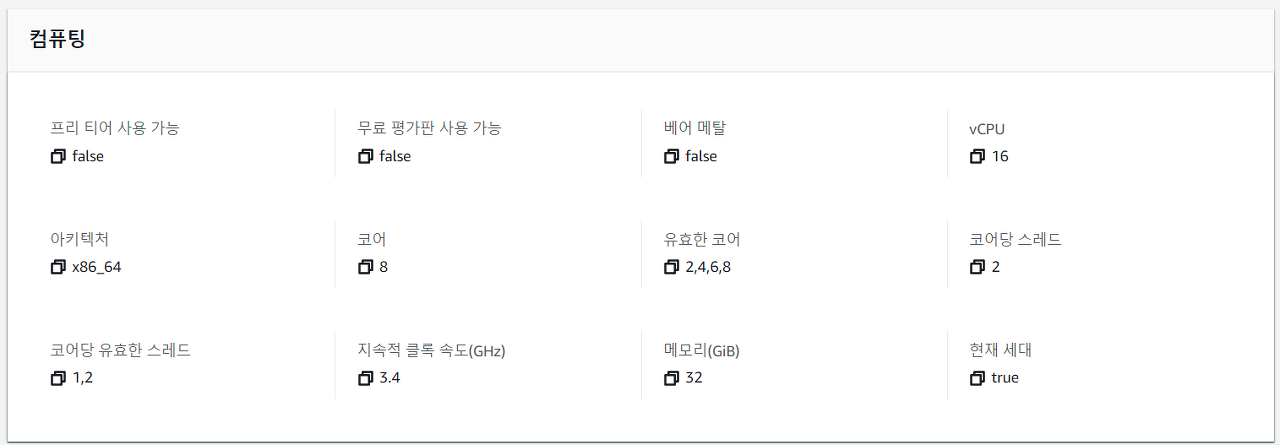 - 아래의 instance는 8코어이지만 vCPU(vCore,가상 논리 프로세서=스레드)는 16입니다.