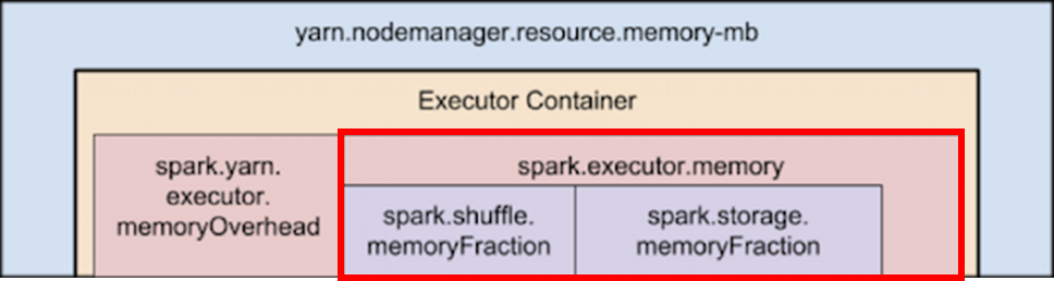 2) spark.storage.unrollFraction 및 spark.storage.safetyFraction(총 메모리의 ~30%) - 이러한 값은 Spark에서 내부적으로 사용되므로 변경하지 않아야 합니다
