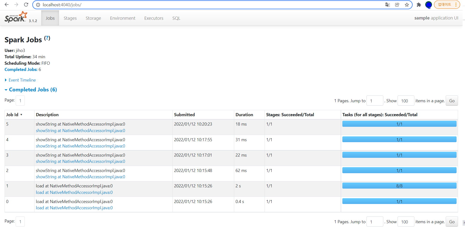 Spark UI는 SparkSession이 생성되면 IP주소:port를 통해 접속할 수 있는데, 보통은 4040포트를 사용한다.