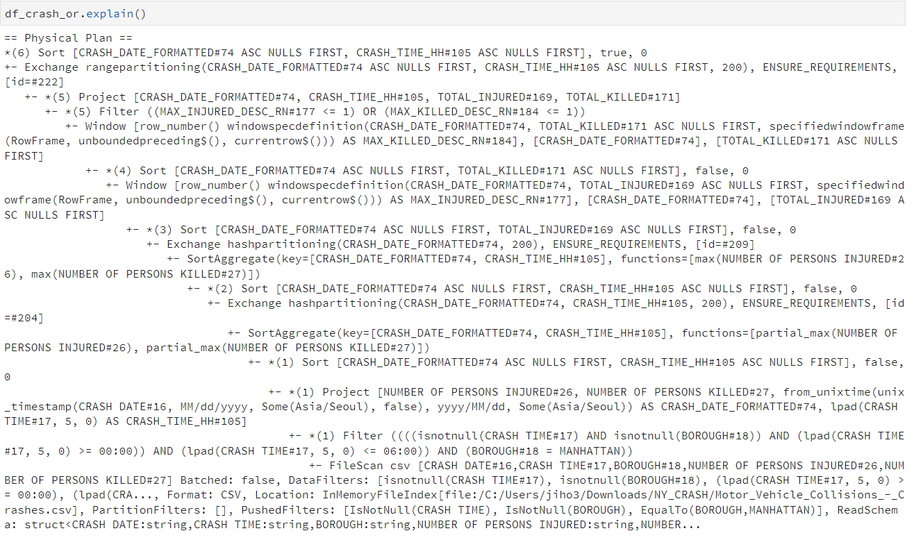 - 필터 조건이 쿼리에서 작성된 것대로 전부 계획에 반영되지 않고, Catalyst Optimizer가 중복된 필터는 제외시키고, 직관적인 새로운 필터를 적용시켜줌