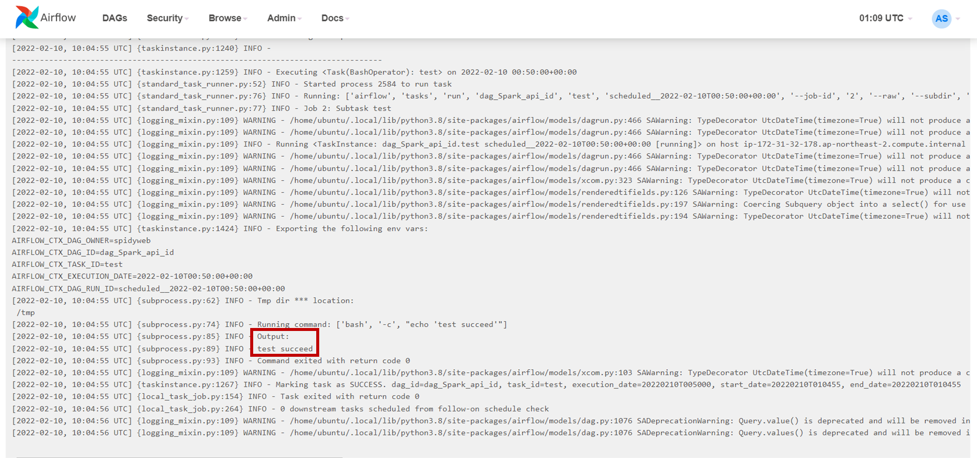 아까 생성한 test.py dag가 성공적으로 실행 됐고 원하는 대로 출력됨