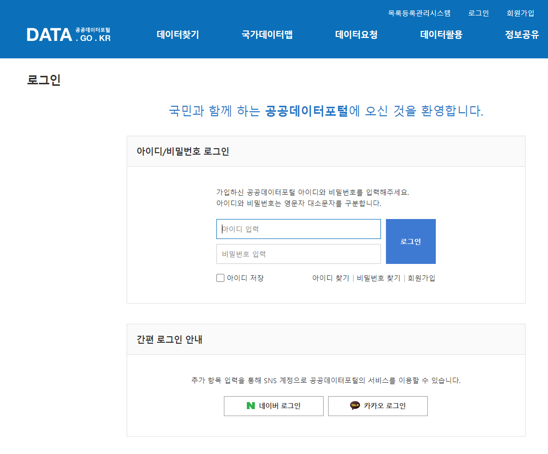 위의 링크에 들어가서 회원가입 or 로그인(네이버, 카카오)를 합니다.