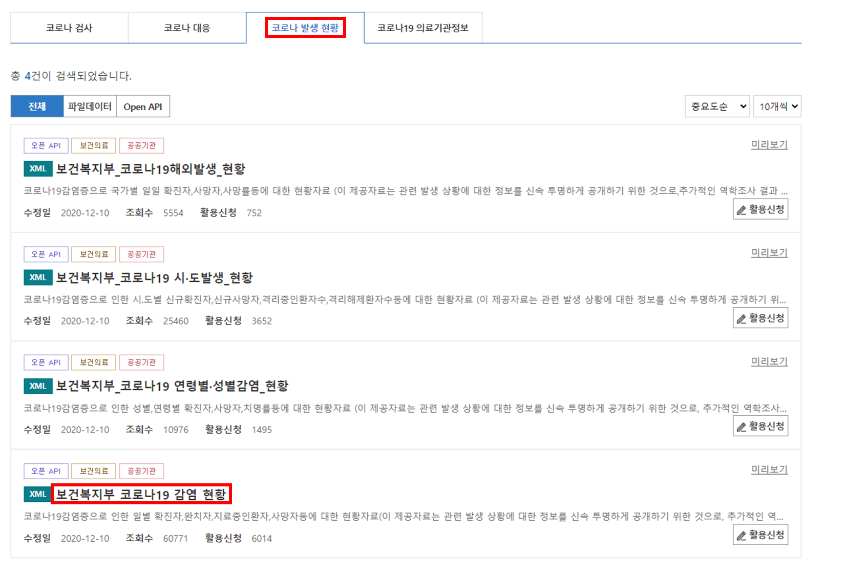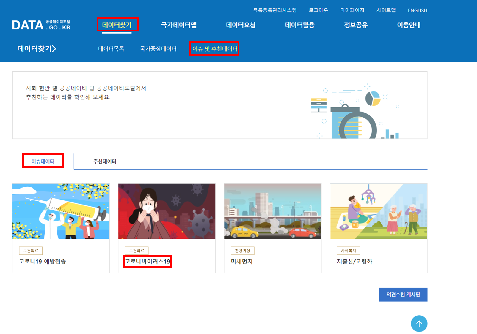로그인 이후에 데이터 찾기 -> 이슈 및 추천 데이터 -> 이슈데이터 -> 코로나바이러스 19