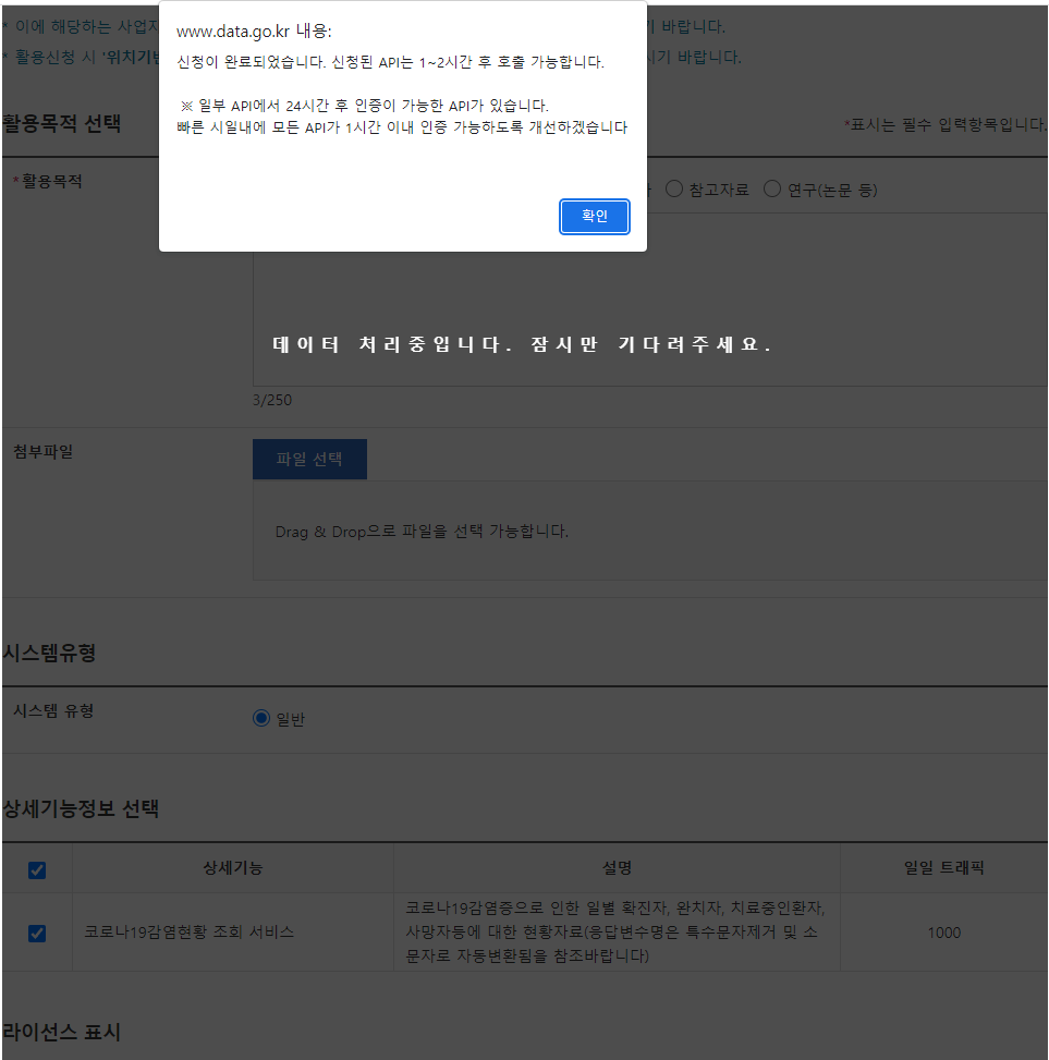 활용 목적 및 동의를 한 후 신청을 하면 다음과 같이 안내 문구가 뜨는데, 실제로 1~2시간 후면 호출이 가능했었고, 더 걸릴 수도 있으니 안되면 좀 더 기다려보고 or 재신청을하는 방법이 있습니다.