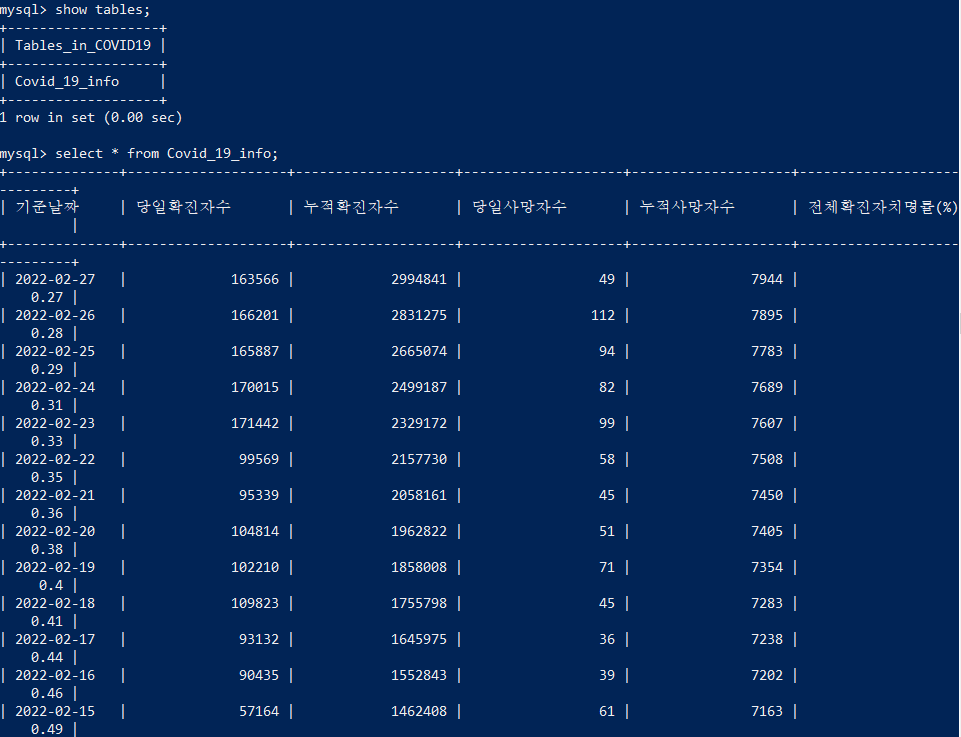 #데이터 조회시 메소드.show() ex)getAllCovidAffectedNumbers().show()