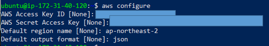 aws configure를 통해 파일에 적혀있는 key를 입력합니다.