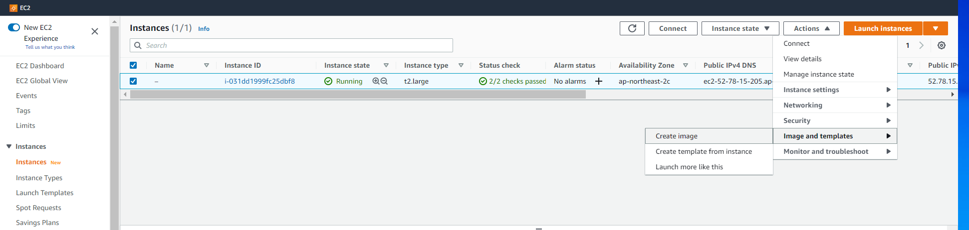 EC2 instances 들어가서 해당 instance 체크박스 클릭 -> image and templates -> create image 로 생성합니다.