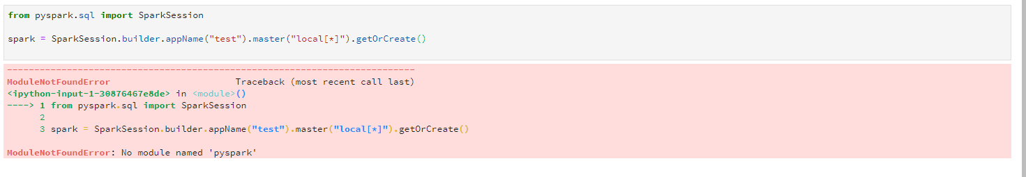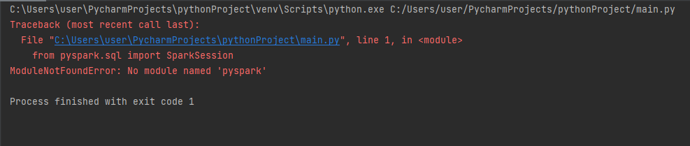 다음 사진과 같이 findspark가 없으면 pyspark를 찾지 못해 에러를 내게 됩니다.