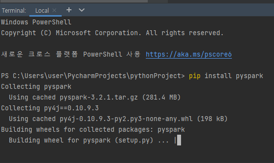 마찬가지로 터미널에서 pip install pyspark를 통해 다운받아줍니다.