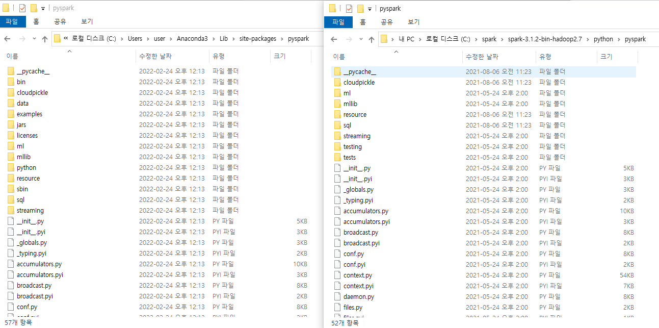 따라서 pyspark를 pip install로 다운받을 시, spark framework속에서 pyspark를 구동하는데 필요한 패키지만 다운로드한다는 것을 알 수 있습니다.